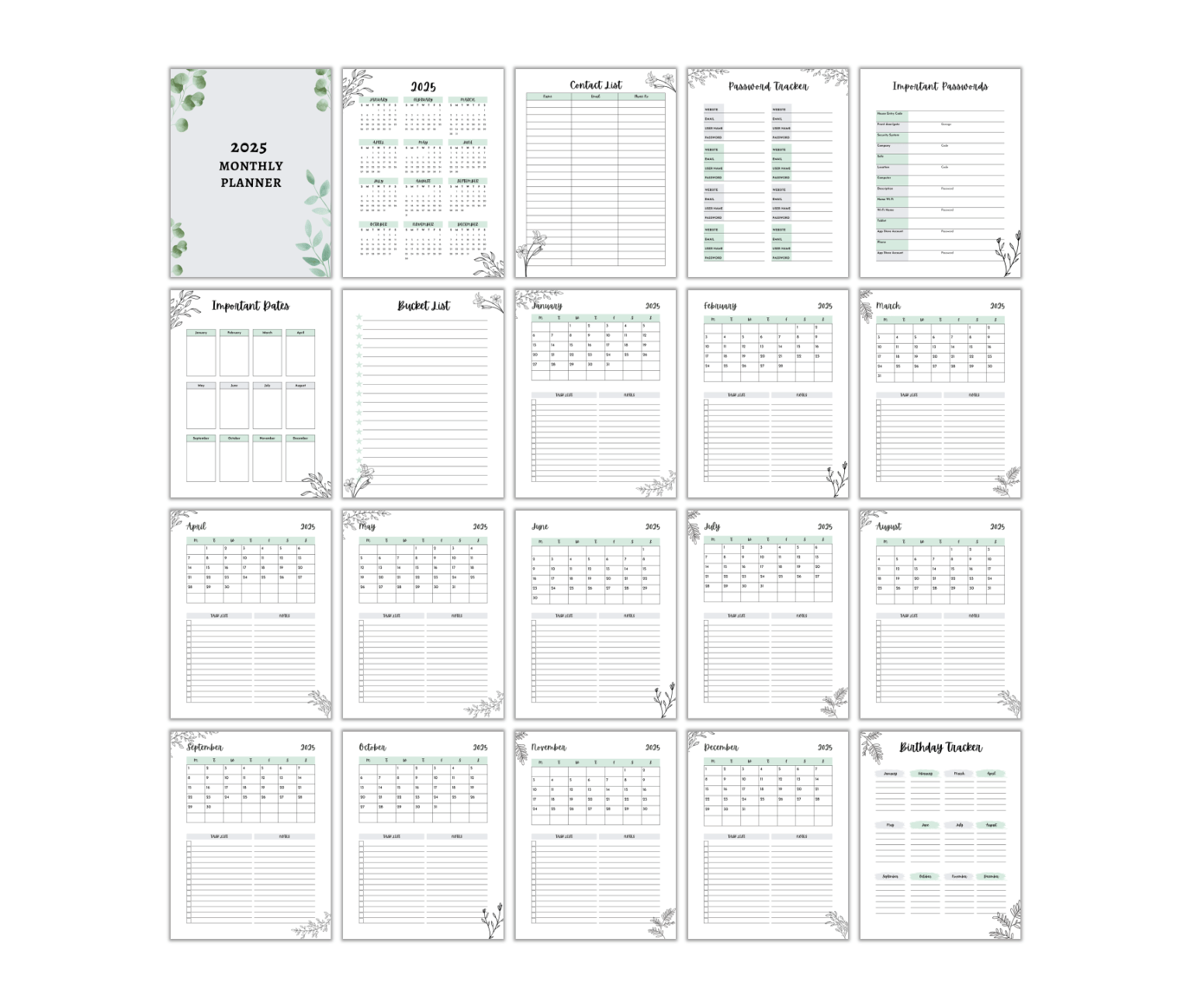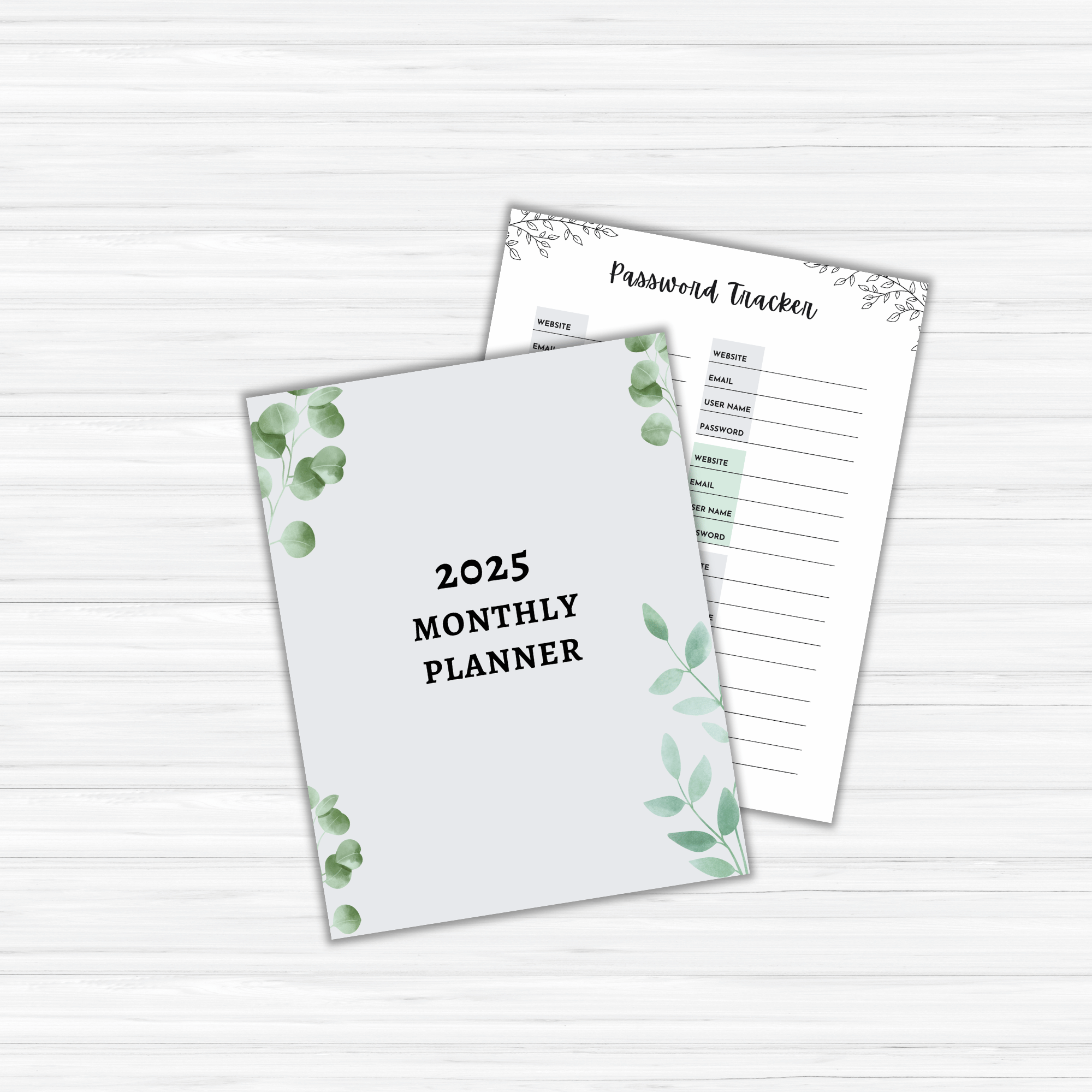 This 2025 Monthly Planner helps users manage their daily commitments with ease! The simple botanical design, and easy to use page layout gives users a stylish and practical way to stay organized.