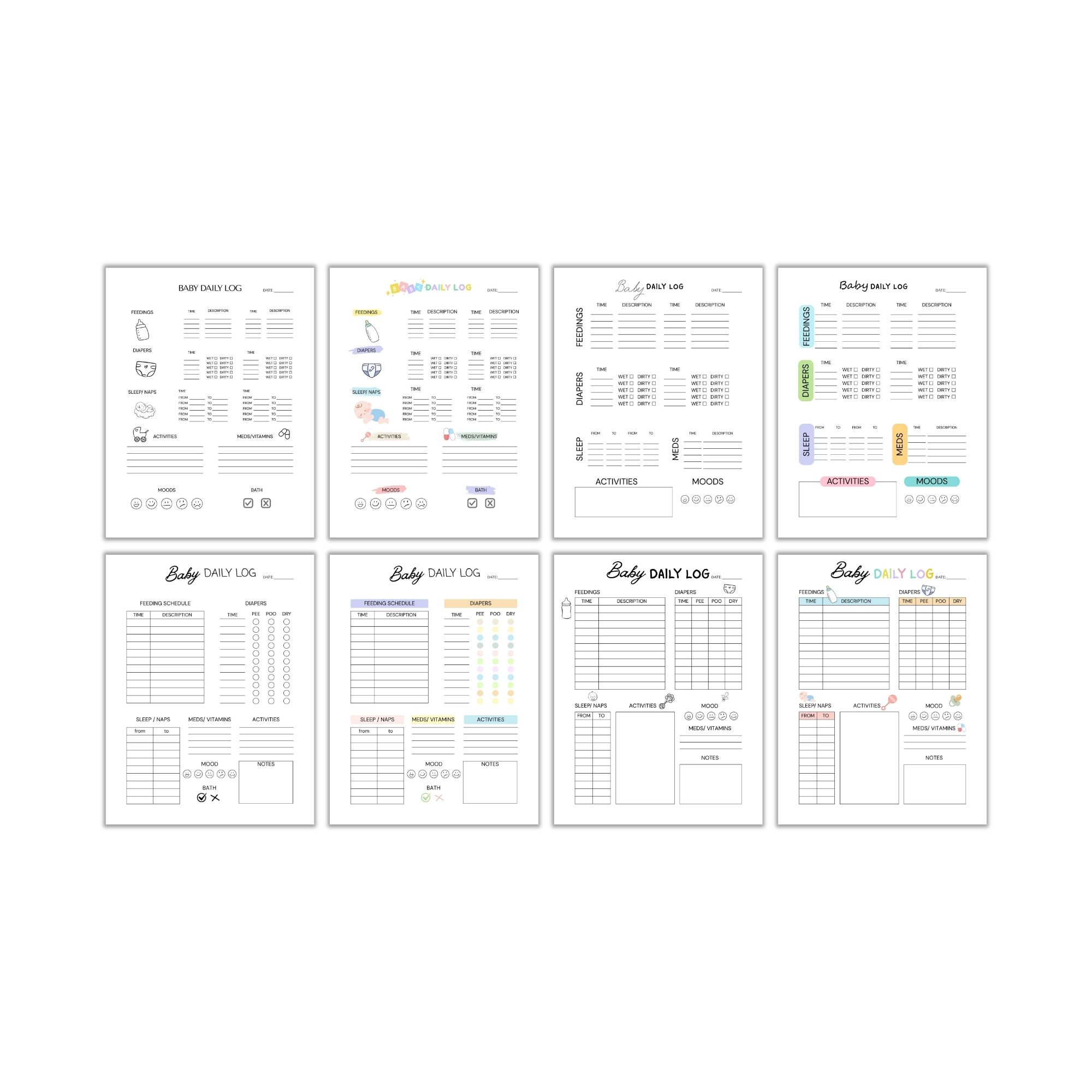 - Daily Log Pages: Track feeding, sleeping, diaper changes, and more with ease.