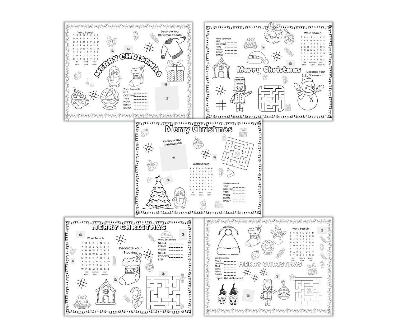 Keep kids entertained this holiday season with our 5-page Christmas Activity Placemat Pack! This fun-filled pack includes popular activities like word scramble, word search, decorate your tree, and coloring pages. Perfect for holiday gatherings, classrooms, or cozy winter days at home!