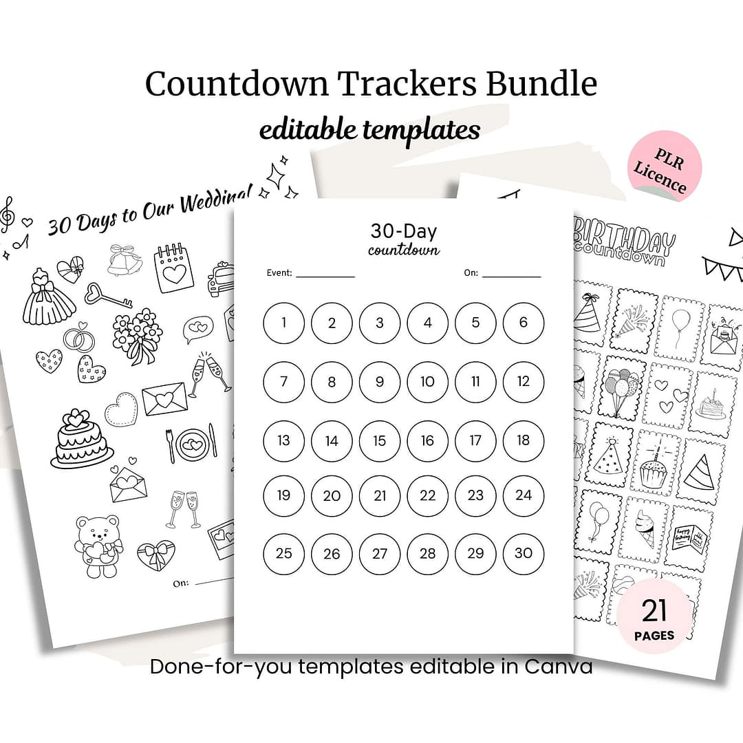 Ready to help your customers stay motivated and excited as they count down to big moments? This Countdown Trackers Bundle gives them flexible, ready-to-use trackers for goals, events, and celebrations, all editable in Canva.