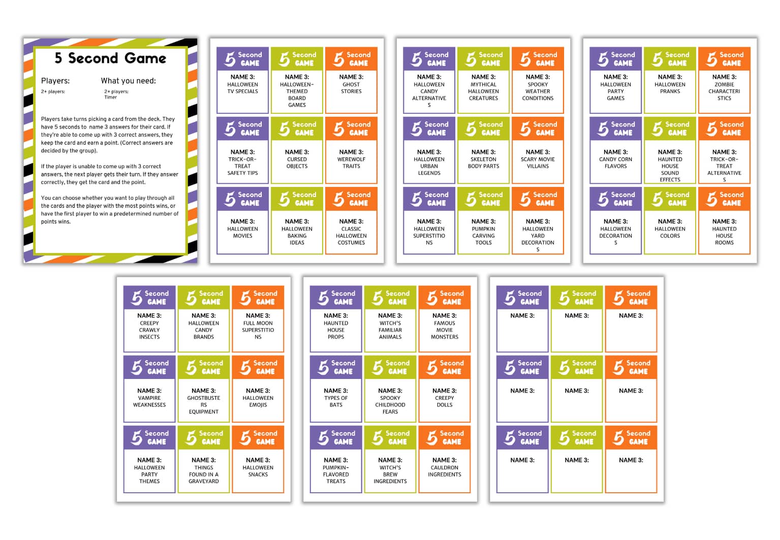 Get ready for fast-paced fun with this 5 Second Game for Halloween! Players must name three items within five seconds. Perfect for adding excitement and laughter to Halloween events!