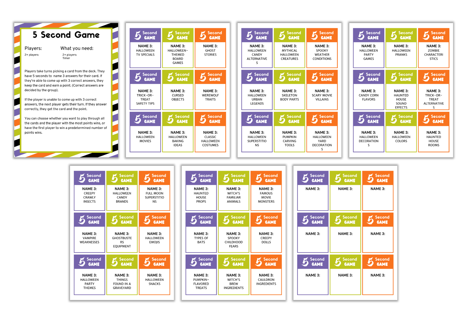 This Halloween 5 Second Games Template is a set of 7 Canva pages that you can edit and resell.