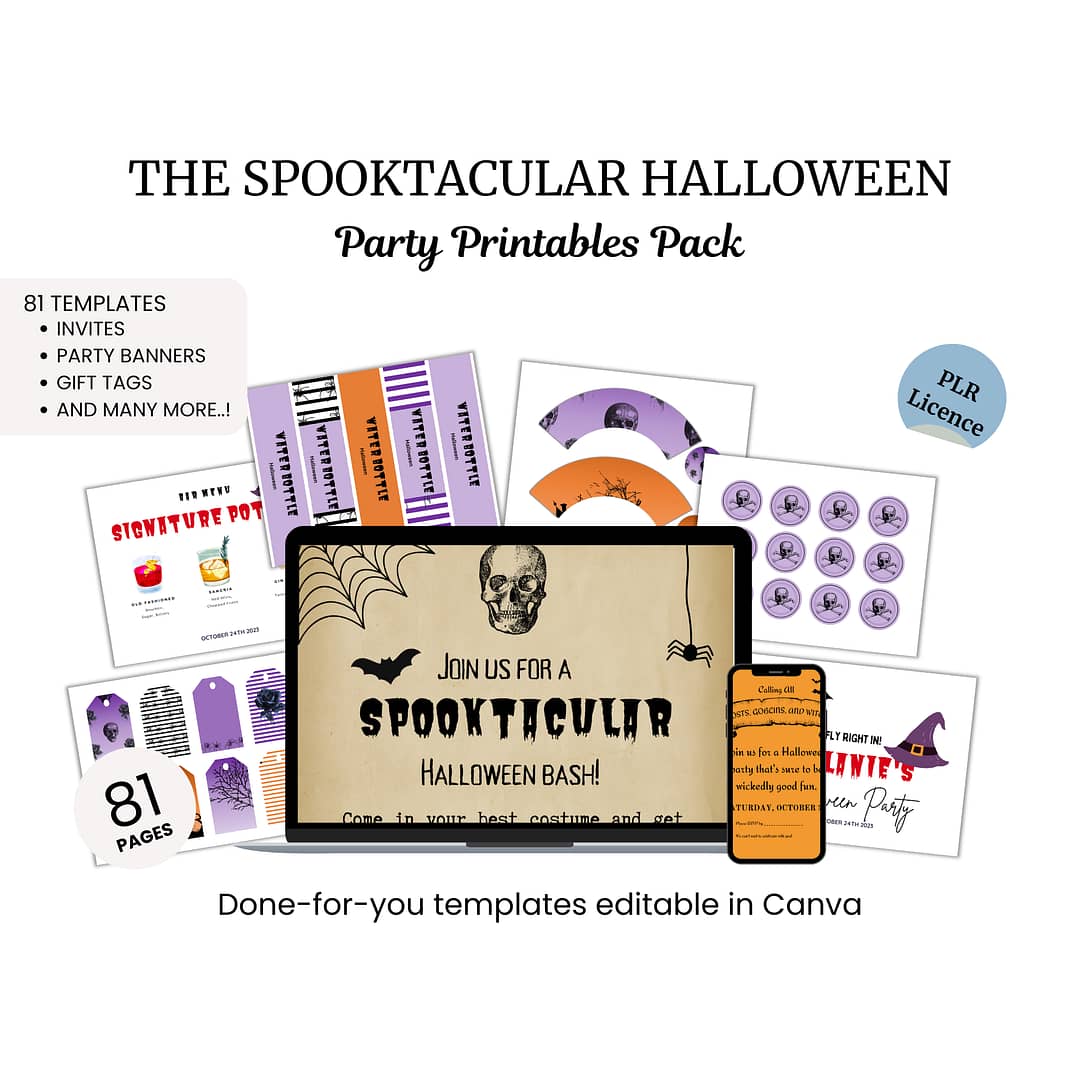 This is a set of 81 Halloween-themed Canva party planner and printable templates.