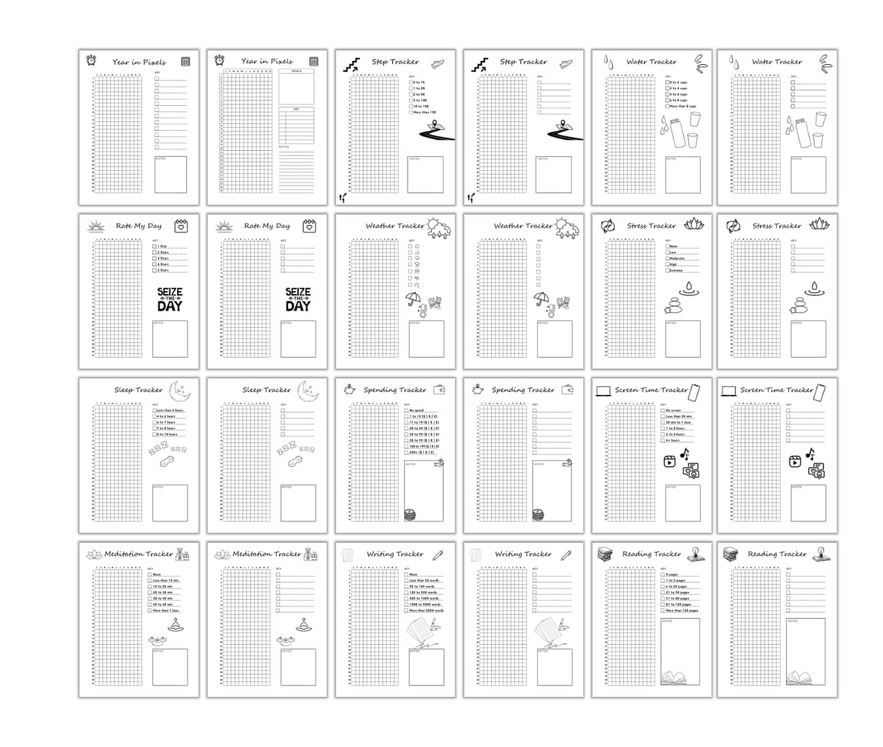 Give your customers a simple yet powerful way to track their lives with this Year in Pixels PLR Tracker Bundle. This ready-made set empowers your audience to monitor moods, habits, anxiety, fitness, finances, hobbies, and more—all without the hassle of designing their own trackers.